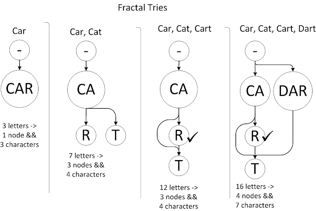 각 leaf 마다 R 개의 널 링크가 필요한데, 그래도 sublinear 라고 말할 수 있는 것이 짧은 문자열들은 common prefix 를 공유한다.