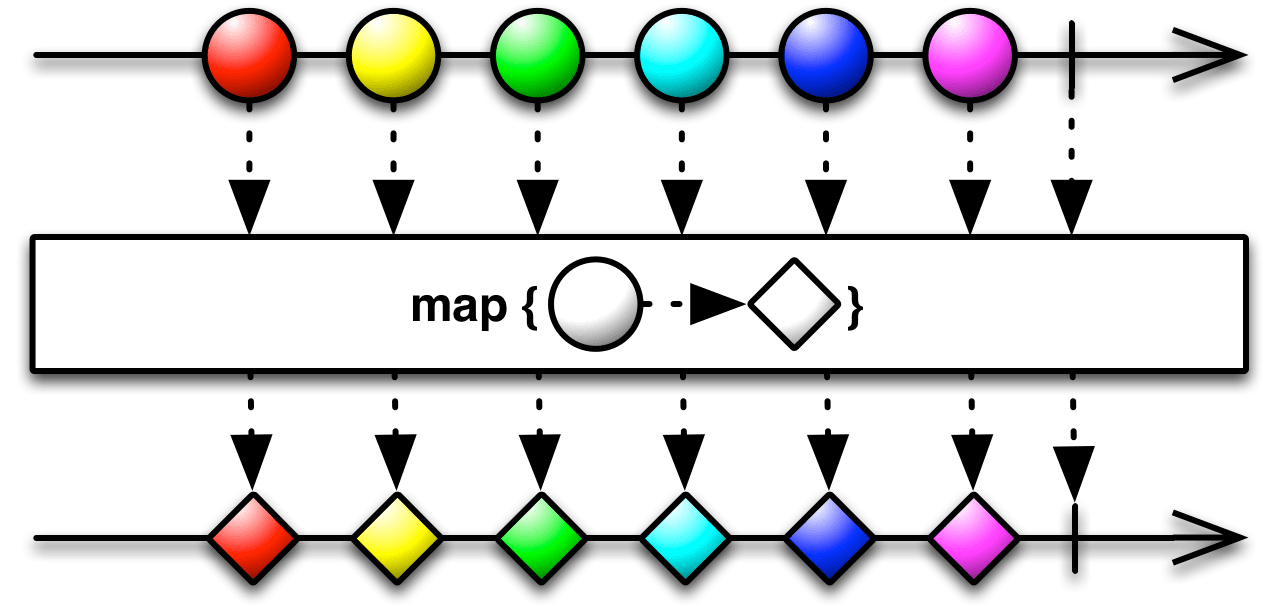 색깔의 순서를 봐야할 필요가 있다. Observable 은 비동기 연산이기 때문에 순서가 좀 달라질 수 있다. 구현에도 그런 부분이 나타나 있는데 아래의 코드에서 flatten 이 의미하는 바는 non-deterministic merge 다.