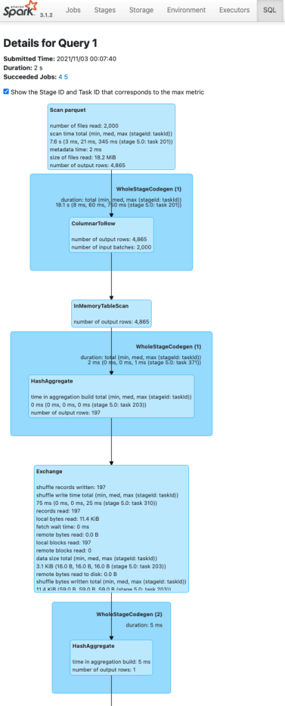 하단의 Details 버튼을 누르거나 explain("FORMATTED") 를 통해 살펴보면 텍스트로 된 실행 계획을 볼 수 있습니다. InMemoryTableScan 을 통해 데이터를 다시 Parquet 로 부터 읽지 않고 메모리에 캐싱된 영역에서 데이터를 읽어 집계합니다.