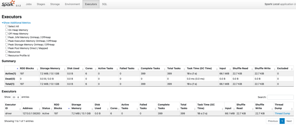 - Executors 탭에서는 cache() 를 호출하기 이전에 비해 Storage Memory 가 늘었습니다.