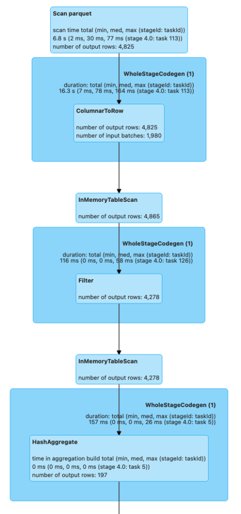 | Arguments: [listing_id#10, listing_url#11, listing_name#12, listing_summary#13, listing_desc#14], CachedRDDBuilder(org.apache.spark.sql.execution.columnar.DefaultCachedBatchSerializer@df15d03,StorageLevel(disk, memory, deserialized, 1 replicas),*(1) ColumnarToRow | |