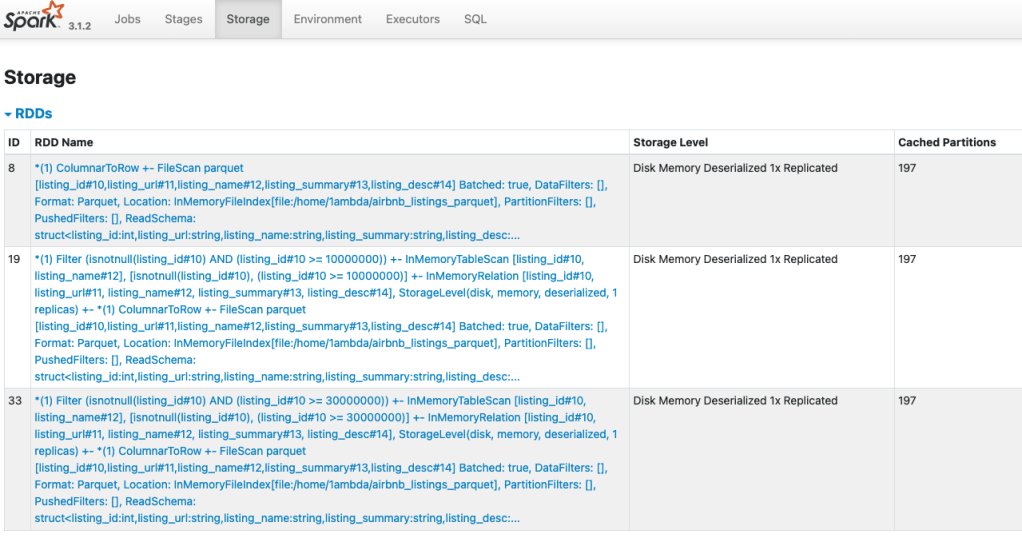 | Arguments: [listing_id#10, listing_name#12], CachedRDDBuilder(org.apache.spark.sql.execution.columnar.DefaultCachedBatchSerializer@df15d03,StorageLevel(disk, memory, deserialized, 1 replicas),*(1) Filter (isnotnull(listing_id#10) AND (listing_id#10 >= 30000000)) | |
